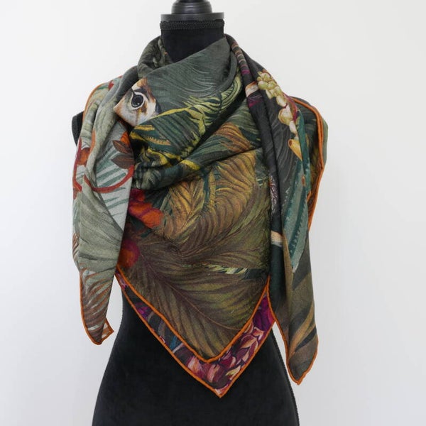 Moderne hoge kwaliteit sjaal van 23% zijde en 77% wol, eigen import dus heel exclusief. Comfortabel zacht en soepel, geschikt voor alle seizoenen. Heldere kleuren en een geweldige textuur. Dit is een dubbelzijdige bedrukking op zijden. De sjaal heeft aan beide kanten verschillende kleuren en is daardoor te dragen als twee verschillende sjaals. Met de hand afgewerkte zoom. De afmeting is 135*135cm. Ook uitermate geschikt als cadeautje, met onze luxe verpakking geeft u een cadeau wat zeker indruk maakt.
