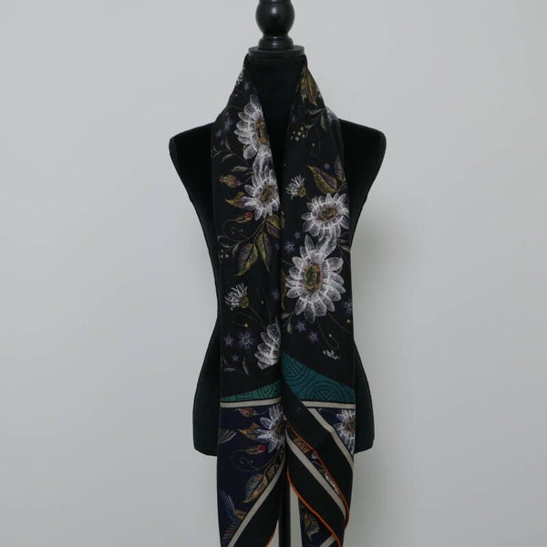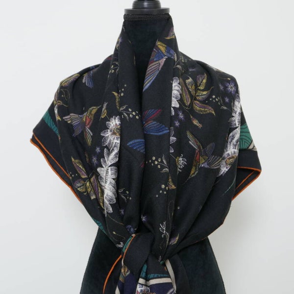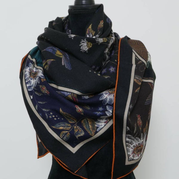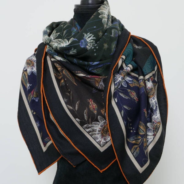 Moderne hoge kwaliteit sjaal van 30% zijde en 70% wol, eigen import dus heel exclusief. Comfortabel zacht en soepel, geschikt voor alle seizoenen. Heldere kleuren en een geweldige textuur. Dit is een enkelzijdige bedrukking op zijden. Met de hand afgewerkte zoom. De afmeting is 135*135cm. Ook uitermate geschikt als cadeautje, met onze luxe verpakking geeft u een cadeau wat zeker indruk maakt.