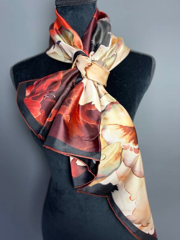 Moderne hoge kwaliteit sjaal, 100% Chinese zijde, eigen import dus heel exclusief. Comfortabel zacht en soepel, geschikt voor alle seizoenen. Heldere kleuren en een geweldige textuur. Dit is een 100% 16 momme zware, zandgewassen moerbeizijde-sjaal van twill en dubbelzijdige bedrukking op zijden. De sjaal heeft aan beide kanten verschillende kleuren en is daardoor te dragen als twee verschillende sjaals. Met de hand afgewerkte zoom. De afmeting is 85*85cm. Ook uitermate geschikt als cadeautje, met onze luxe verpakking geeft u een cadeau wat zeker indruk maakt.