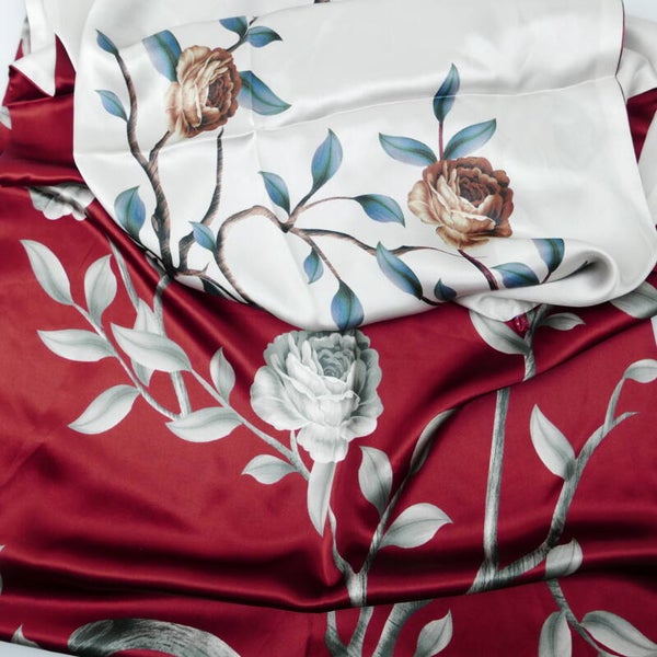Moderne hoge kwaliteit sjaal, 100% Chinese zijde, eigen import dus heel exclusief. Comfortabel zacht en soepel, geschikt voor alle seizoenen. Heldere kleuren en een geweldige textuur. Dubbelzijdig en tweekleurig. Één zijde is rood met lichtgrijze camelia bloemen. De andere kant is grijs met camelia bloemen. Voelt zacht en zeer comfortabel om te dragen. Door knoopjes aan de randen kan de sjaal worden gedragen als een cape. De afmeting is 172 * 52 cm. Ook uitermate geschikt als cadeautje, met onze luxe verpakking geeft u een cadeau wat zeker indruk maakt.
