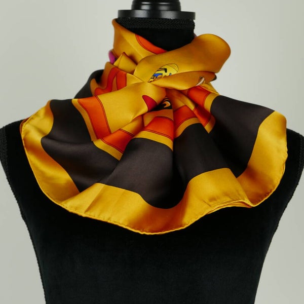 Moderne hoge kwaliteit sjaal, 100% Chinese 16 momme moerbeizijde, eigen import dus heel exclusief. Comfortabel zacht en soepel, geschikt voor alle seizoenen. Heldere kleuren en een geweldige textuur. De sjaal heeft een afbeelding van een paard, een koets en een mens, met oranje en zwarte riemen als rand. De kleur is okergeel-oranje met bruine, rode, blauwe en roze accenten. Zeer stijlvolle en klassieke stijl. Zoom met de hand genaaid. De maat is 105 * 105. uitermate geschikt als cadeautje, met onze luxe verpakking geeft u een cadeau wat zeker indruk maakt.