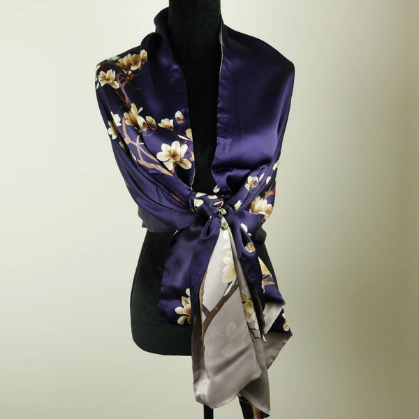 Moderne hoge kwaliteit sjaal, 100% Chinese zijde, eigen import dus heel exclusief. Comfortabel zacht en soepel, geschikt voor alle seizoenen. Heldere kleuren en een geweldige textuur. Dubbelzijdig en tweekleurig. De voorkant is donkerblauw met magnoliabloemen. De andere kant is grijs met magnoliabloemen. Voelt zacht en zeer comfortabel om te dragen. Door knoopjes aan de randen kan de sjaal worden gedragen als een cape. De afmeting is 172 * 52 cm. Ook uitermate geschikt als cadeautje, met onze luxe verpakking geeft u een cadeau wat zeker indruk maakt.