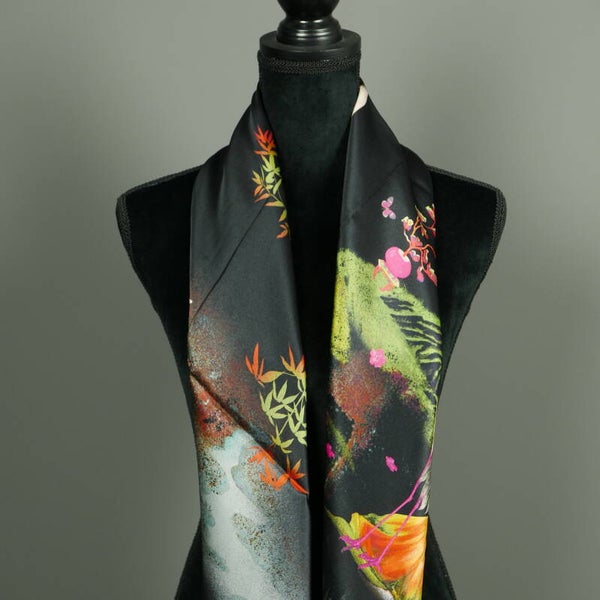 Moderne hoge kwaliteit sjaal, 100% Chinese zijde, eigen import dus heel exclusief. Comfortabel zacht en soepel, geschikt voor alle seizoenen. Heldere kleuren en een geweldige textuur. Dit is een dubbelzijdige bedrukking op zijden. De sjaal heeft aan beide kanten verschillende kleuren en is daardoor te dragen als twee verschillende sjaals. Met de hand afgewerkte zoom. De afmeting is 110*110cm. Ook uitermate geschikt als cadeautje, met onze luxe verpakking geeft u een cadeau wat zeker indruk maakt.