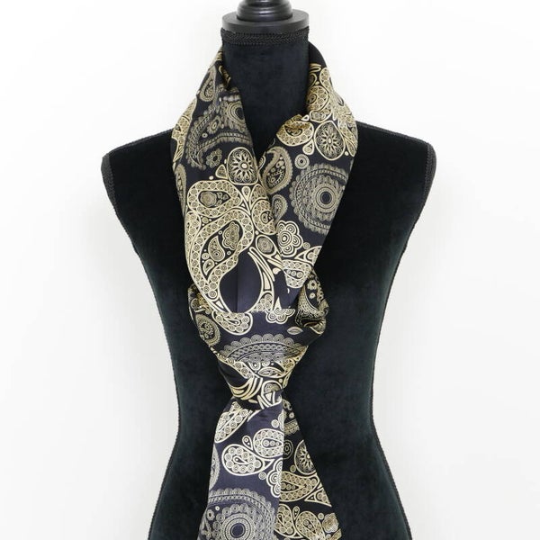 Moderne hoge kwaliteit sjaal, 100% Chinese zijde, eigen import dus heel exclusief. Comfortabel zacht en soepel, geschikt voor alle seizoenen. Heldere kleuren en een geweldige textuur. Dit is een 100% 16momme moerbei zijden sjaal. De hoofdkleuren zijn zwart en goud. Deze sjaal heeft een klassiek cashew-stijl patroon met McQueen- schedels. De kleur van de zijden sjaal is veelzijdig. De zijden sjaal voelt bijzonder goed aan. Het is erg comfortabel om te dragen. De randen van de zijden sjaal zijn met de hand gezoomd. De afmeting is 140 * 140 cm. Ook uitermate geschikt als cadeautje. Met onze luxe verpakking geeft u een cadeau wat zeker indruk maakt.