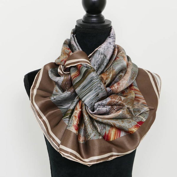 Moderne hoge kwaliteit sjaal, 100% Chinese zijde, eigen import dus heel exclusief. Comfortabel zacht en soepel, geschikt voor alle seizoenen. Heldere kleuren en een geweldige textuur. Dit is een 100% 14 momme moerbei zijden sjaal. De sjaal heeft een abstract patroon wat lijkt op marmer en een bruine rand. De zijden sjaal voelt bijzonder goed aan. Het is erg comfortabel om te dragen. De randen van de zijden sjaal zijn met de hand gezoomd. De afmeting is 110 * 110 cm. Ook uitermate geschikt als cadeautje. Met onze luxe verpakking geeft u een cadeau wat zeker indruk maakt.