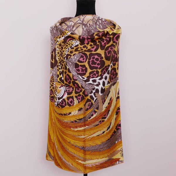 Moderne hoge kwaliteit sjaal, 100% Chinese zijde, eigen import dus heel exclusief. Comfortabel zacht en soepel, geschikt voor alle seizoenen. Heldere kleuren en een geweldige textuur. Deze sjaal heeft een veren patroon met een luipaard afbeelding. Deze sjaal is schuin geweven met zand gewassen zijde en heeft daardoor een matte twill textuur. De randen zijn met de hand gezoomd. De afmeting is 90*90 cm. Heldere kleuren en een geweldige textuur. Ook uitermate geschikt als cadeautje, met onze luxe verpakking geeft u een cadeau wat zeker indruk maakt.