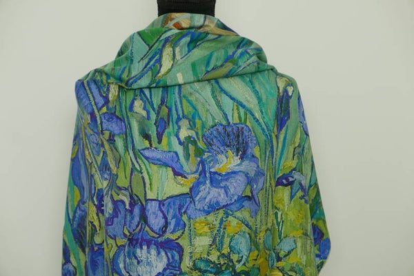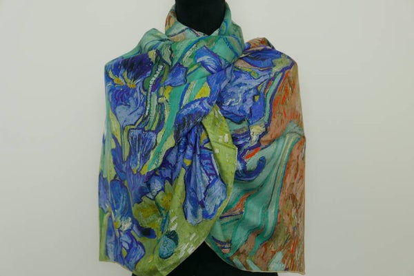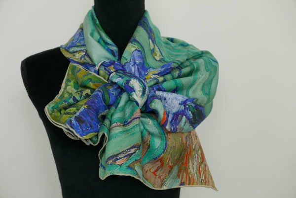 Moderne hoge kwaliteit sjaal, 100% Chinese zijde, eigen import dus heel exclusief. Comfortabel zacht en soepel, geschikt voor alle seizoenen. Heldere kleuren en een geweldige textuur. De sjaal is blauw, groen met een afbeelding van geschilderde iris bloemen van Van Gogh. De sjaal is schuin geweven en heeft daardoor een matte twill textuur. De kleur van de zijden sjaal is veelzijdig. De zijden sjaal voelt bijzonder goed aan. Het is erg comfortabel om te dragen. De randen van de zijden sjaal zijn met de hand gezoomd. De afmeting is 110* 110cm. Ook uitermate geschikt als cadeautje. Met onze luxe verpakking geeft u een cadeau wat zeker indruk maakt.