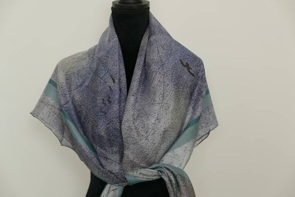 Moderne hoge kwaliteit sjaal, 100% Chinese zijde, eigen import dus heel exclusief. Comfortabel zacht en soepel, geschikt voor alle seizoenen. De sjaal is blauw, zwart met een afbeelding van een lucht met vogels. De sjaal is van sirisa zijde en voelt bijzonder goed aan. Het is erg comfortabel om te dragen. De randen van de zijden sjaal zijn met de hand gezoomd. De afmeting is 110* 110 cm. Ook uitermate geschikt als cadeautje. Met onze luxe verpakking geeft u een cadeau wat zeker indruk maakt.