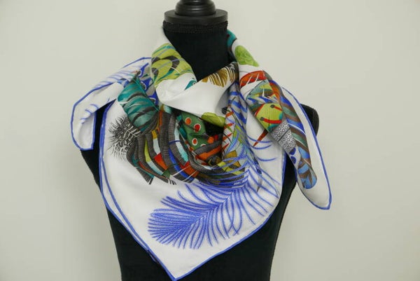 Moderne hoge kwaliteit sjaal, 100% Chinese zijde, eigen import dus heel exclusief. Comfortabel zacht en soepel, geschikt voor alle seizoenen. Heldere kleuren en een geweldige textuur. Dit is een 100% 18 momme moerbeizijde-sjaal van twill.De kleur van de zijden sjaal is veelzijdig en is versierd met afbeeldingen van veren. De zijden sjaal voelt bijzonder goed aan. Het is erg comfortabel om te dragen. De randen van de zijden sjaal zijn met de hand gezoomd. De afmeting is 90* 90 cm. Ook uitermate geschikt als cadeautje. Met onze luxe verpakking geeft u een cadeau wat zeker indruk maakt.